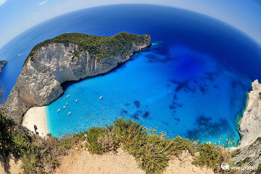 Zakynthos. Plaża i Zatoka Wraku (Navagio) widziane z klifu. Zdjęcie wykonane z platformy widokowej.