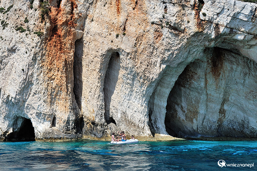 Zakynthos, Błękitne Groty. Mały pontonik versus skały i wzburzone morze.